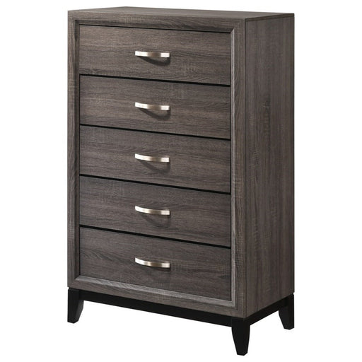 With its clean-lined look and modern attitude, this chest of drawers is a fresh style awakening. A warm charcoal hue over replicated oak grain easi...